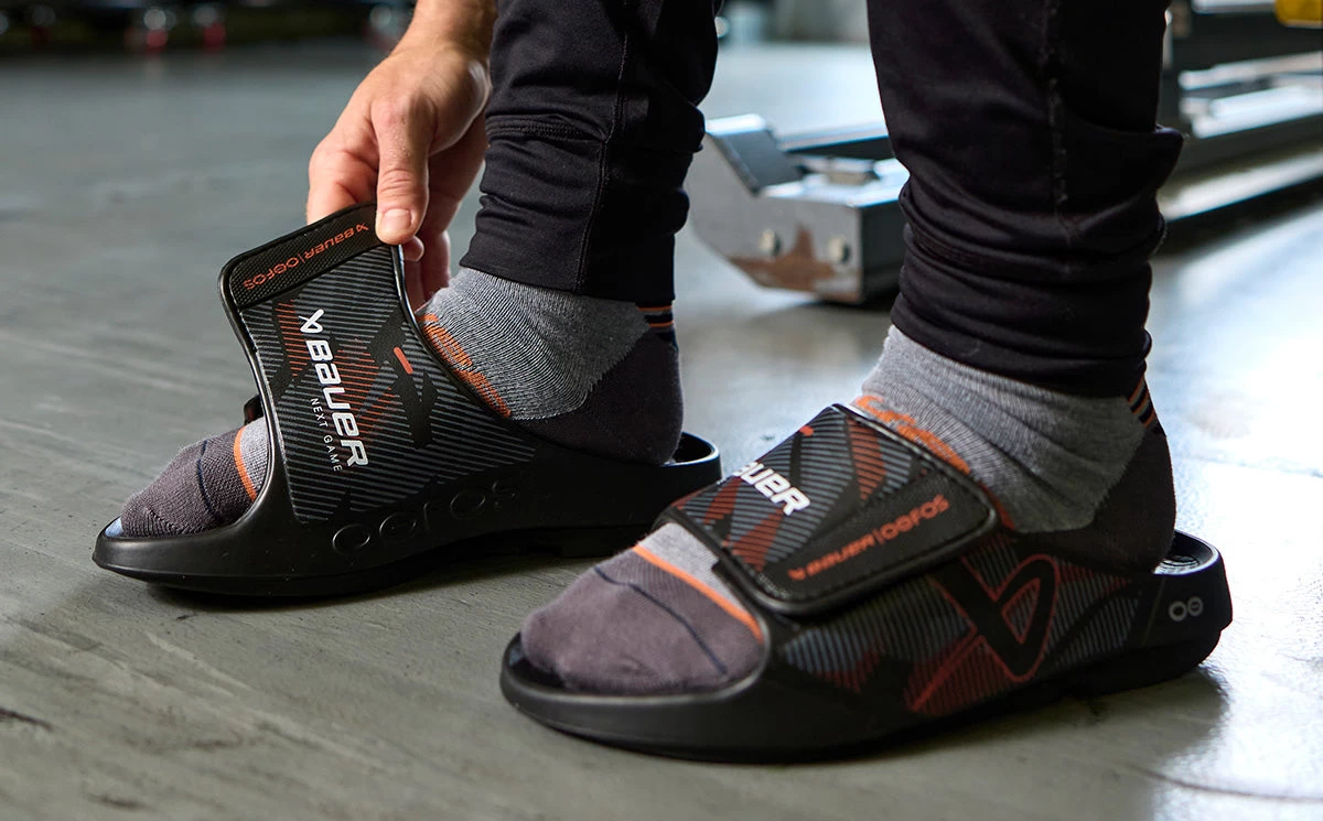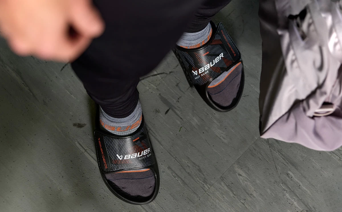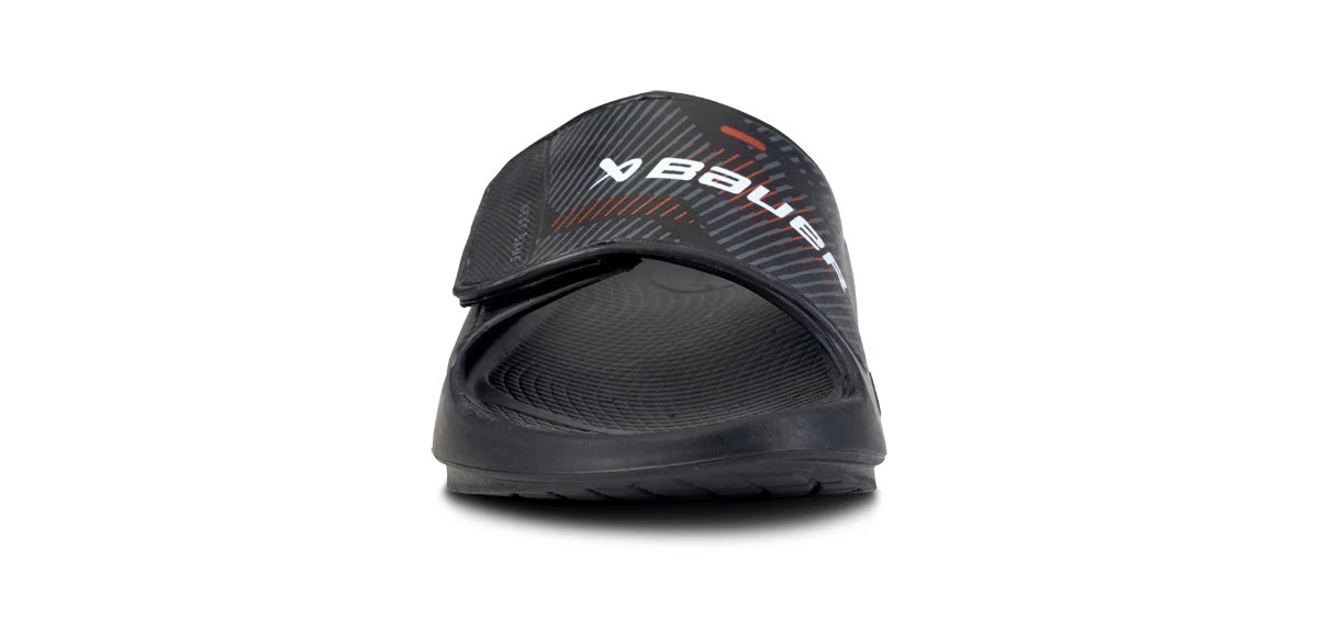 Perfect for sliding on and off between games or training sessions, the NEXT GAME slide collection by Bauer features OOFOS proprietary OOfoam ™ technology, which absorbs impact on a player’s foot, ankle and body. Combined with a patented footbed design, OOFOS cradle the heel and arches for the optimal combination of soft and stable support. OOfoam™ technology is proven to absorb 37% more impact than traditional foam materials, reducing load and stress on joints, ankles and feet, so you can recover faster.